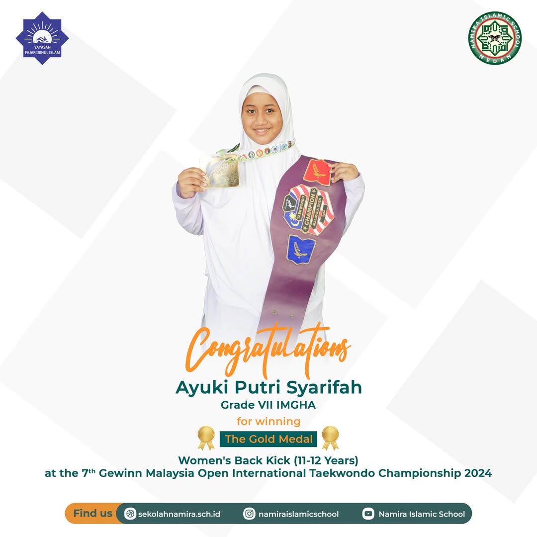 Congratulations to Ayuki Putri Syarifah grade VII IMGHA @smpnamiramedan for winning the Gold Medal in the Women’s 11-12 Years Back Kick category at the 7th Gewinn Malaysia Open International Taekwondo Championship 2024