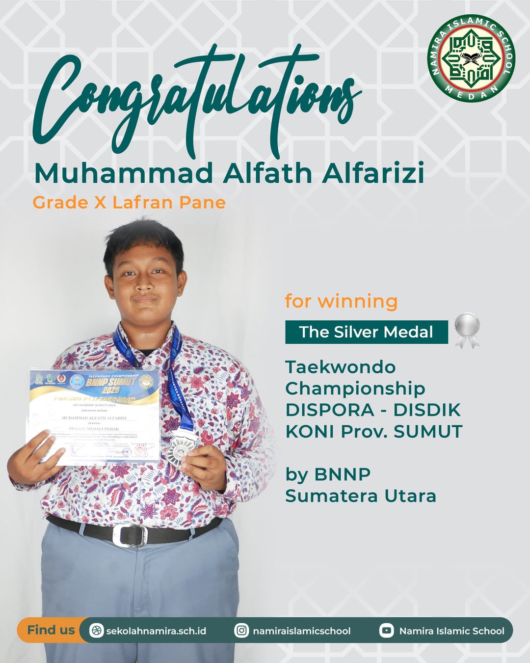 Selamat kepada Muhammad Alfath Alfarizi grade X Lafran Pane @smanamiramedan atas capaian prestasi sebagai juara dalam gelaran Taekwondo Championship DISPORA – DISDIK – KONI Prov. Sumatera Utara by BNNP Sumatera Utara